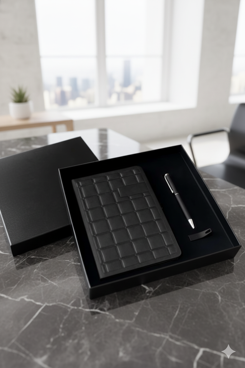 طقم تنفيذي 3 في 1: يتضمن دفتر ملاحظات أسود، وقلم معدني، وفلاش ميموري USB.