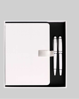 طقم هدايا أنيق 3 قطع: يتضمن دفتر ملاحظات A5 أبيض وقلمين أنيقين.