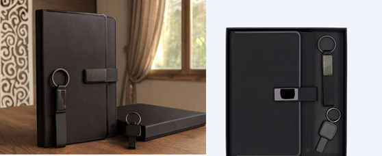 طقم هدايا تنفيذي قطعتين: يتضمن دفتر ملاحظات A5 أسود فاخرًا وميدالية مفاتيح معدنية أنيقة.
