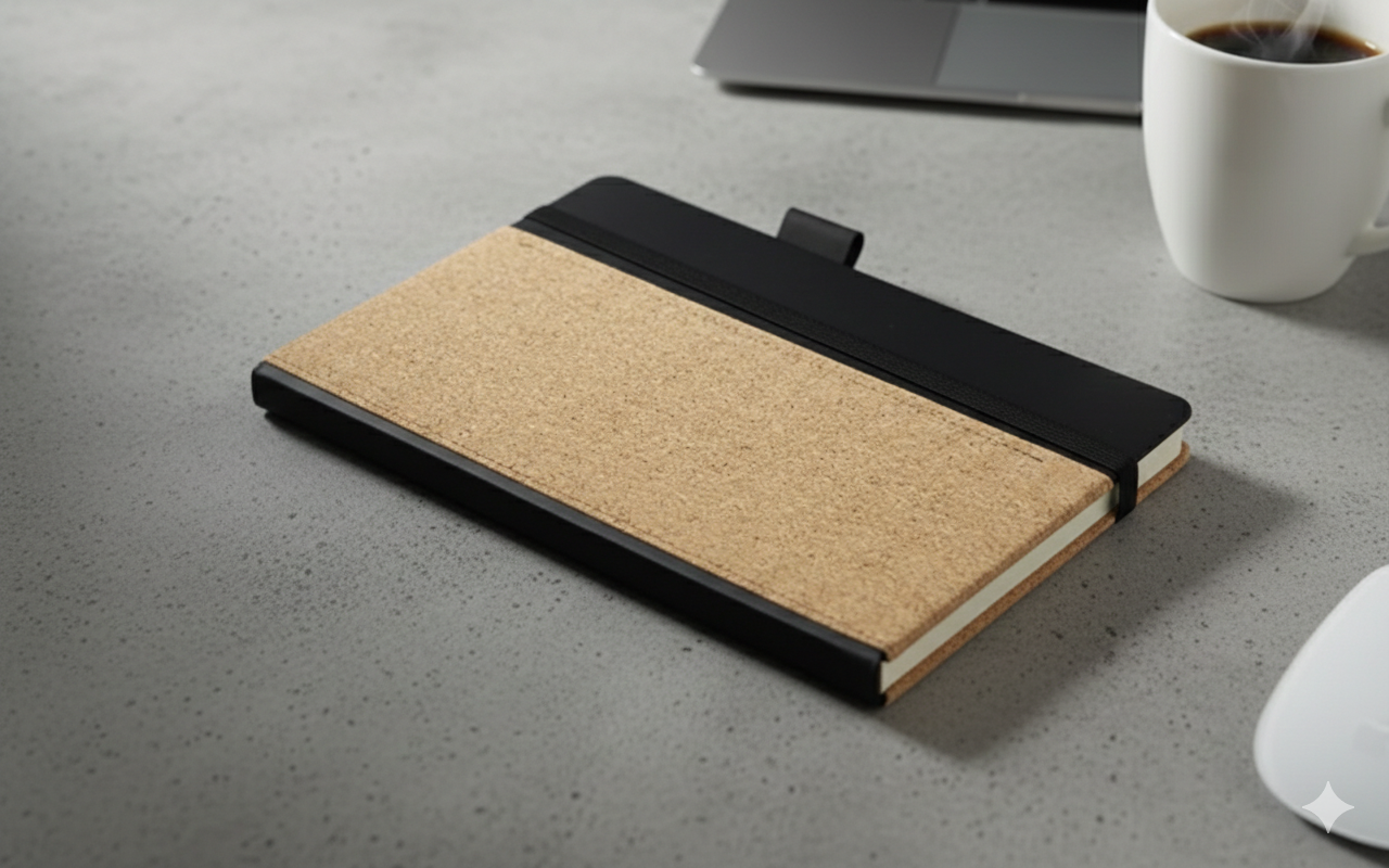 متين وأنيق: يجمع بين نسيج الفلين الترابي والتصميم العصري — مثالي للعمل أو الدراسة أو تدوين اليوميات.