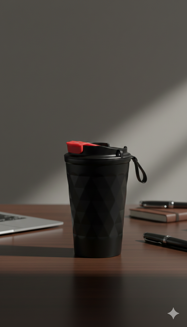 The elegant black finish, ribbed grip, and practical carrying/hanging handle ensure comfortable handling and easy portability. The secure, leak-proof lid features a red flip-lock mechanism for quick opening and closing, preventing spills inside your bag.