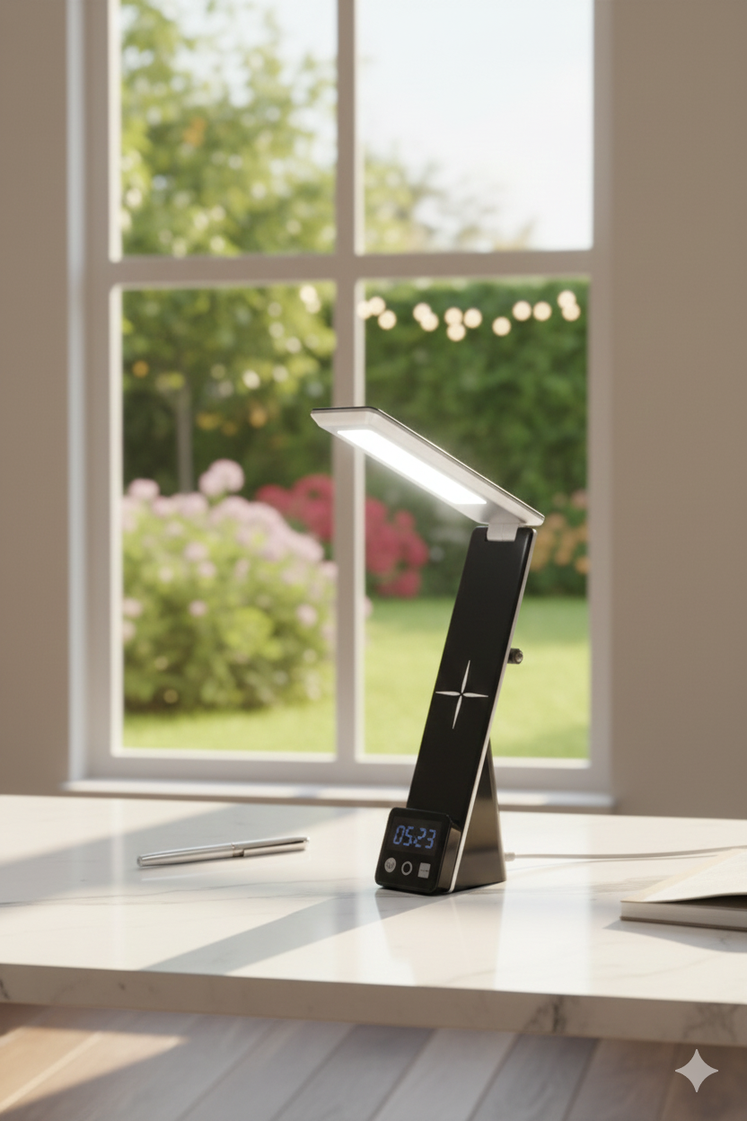 The 6-in-1 Wireless Elegant Desk Set (WCT7) is the ultimate desk companion, designed to enhance productivity while maintaining a clean and modern workspace. Its foldable, space-saving design combines powerful LED lighting, multi-device wireless charging, and time management features in one elegant unit.