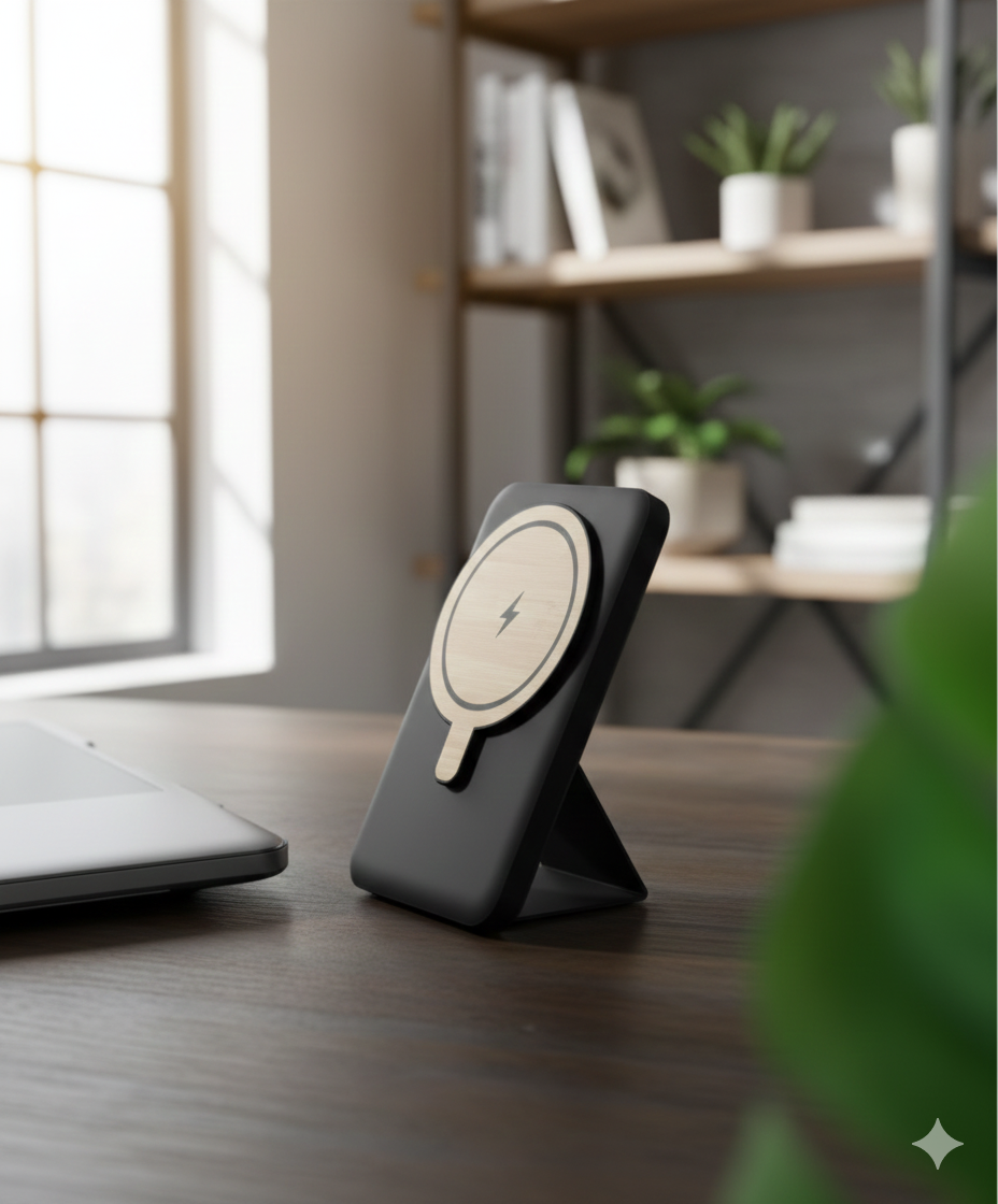 The foldable stand allows comfortable phone viewing while charging, and the durable black rubber back ensures a secure grip. With support for both wireless and wired charging options, this power bank delivers practical performance in a sleek, eco-friendly design.