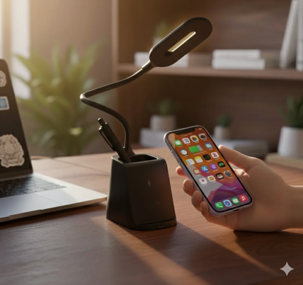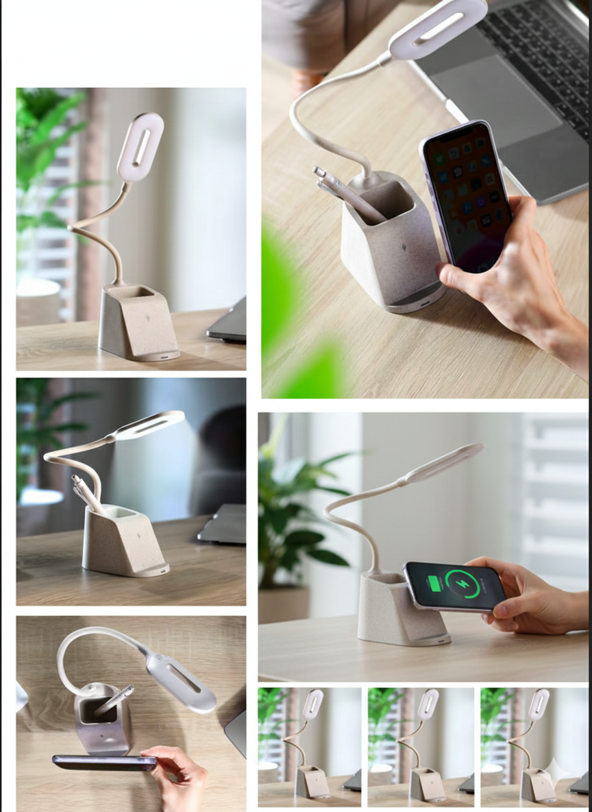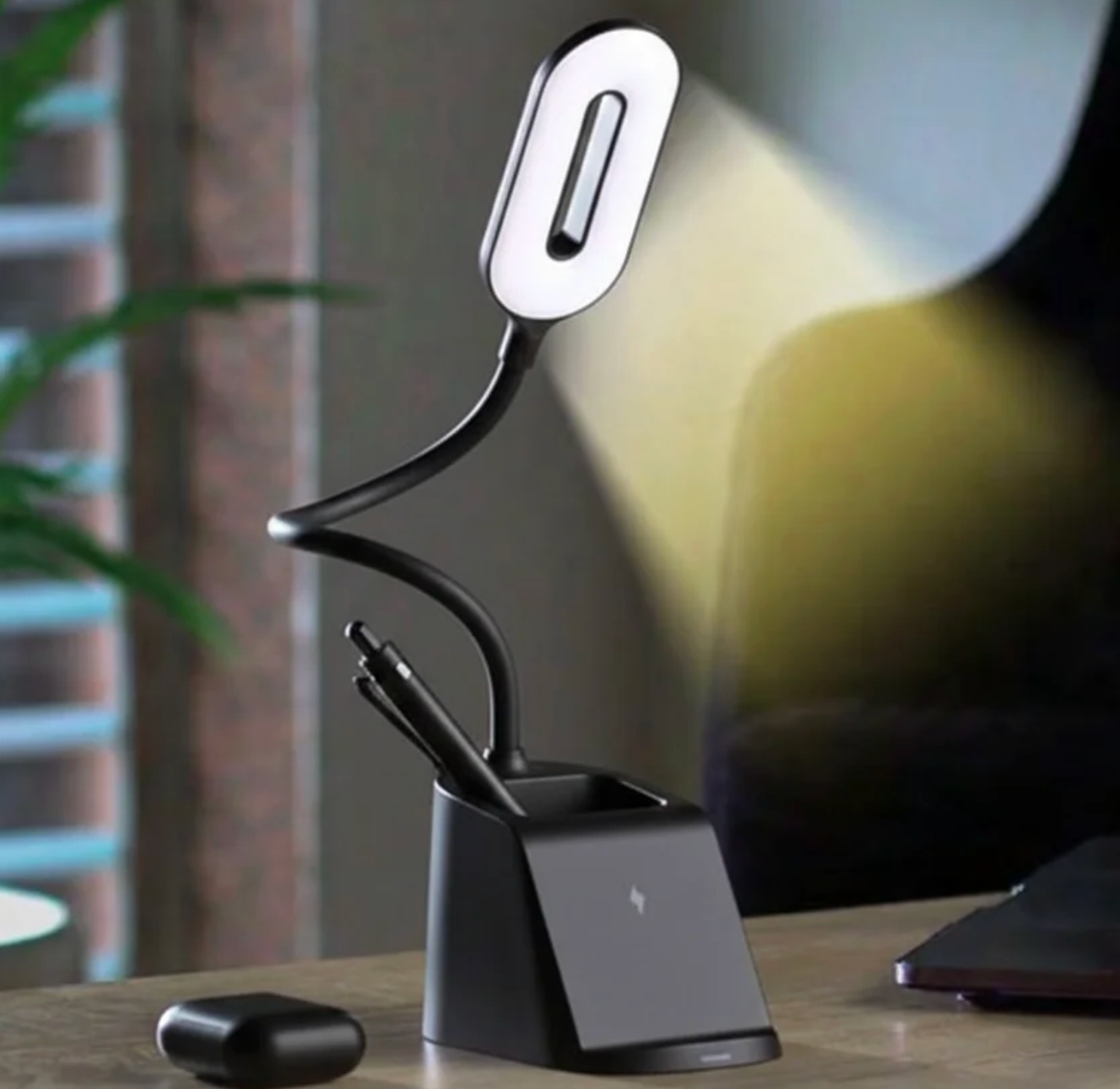 It features a built-in wireless charging base for your smartphone and an integrated pen holder to keep your desk organized.