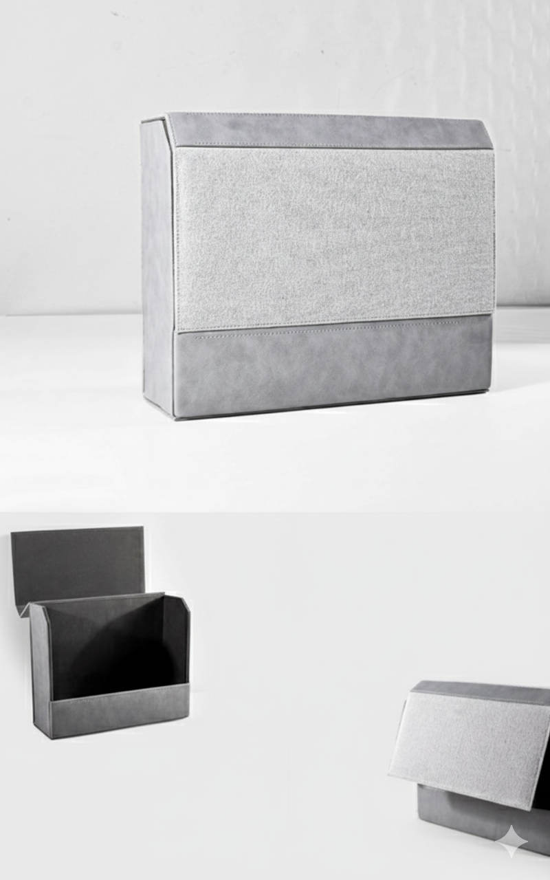Featuring a spacious interior with a foldable-look design, the box allows efficient organization of multiple items in one refined presentation. Crafted from soft gray leather blended with premium fabric, it delivers a balanced look of durability and sophistication. The magnetic closure ensures smooth handling while keeping contents securely enclosed.