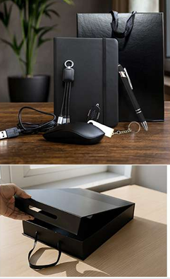 This premium office gift set combines elegance with everyday functionality. It includes a stylish leather notebook for notes, a smooth-writing pen, a responsive wireless mouse, and a multi charging cable for flexible use across devices.