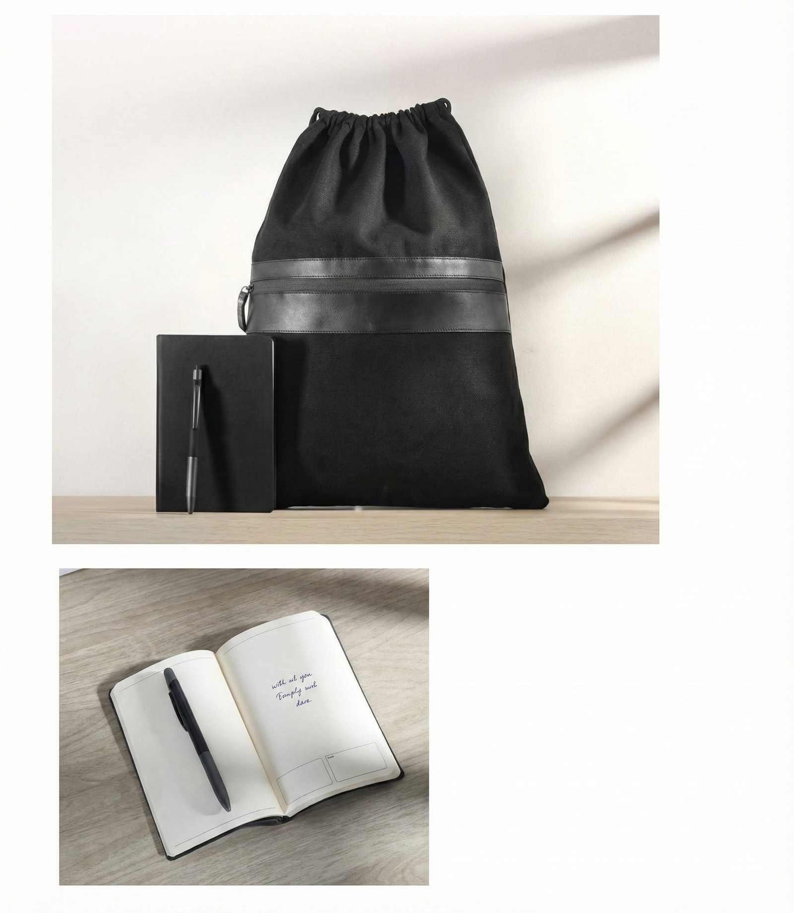 This premium set combines an elegant black drawstring bag with a professional hard-cover notebook and matching pen. The bag features a sleek black design with a stylish horizontal strip, making it suitable for daily use at work, university, or casual meetings. It is lightweight, versatile, and designed to carry essential items comfortably.