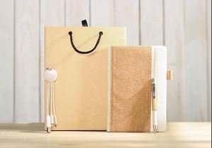 Discover the premium gift set that combines elegance with sustainability. It features a durable, recyclable kraft presentation bag, a selection of organic notebooks such as the Cork Notebook made from renewable natural cork, and a smart 3-in-1 charging cable with a modern, innovative design. This set is perfect for office or personal gifting, offering a sophisticated and practical touch.