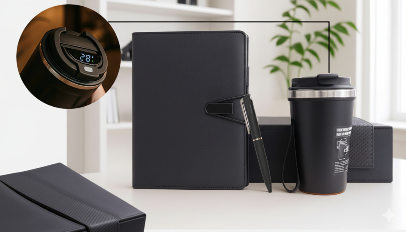Experience modern elegance with this VIP Digital Business Gift Set, combining a smart temperature mug, a premium notebook, and a sleek metal pen.